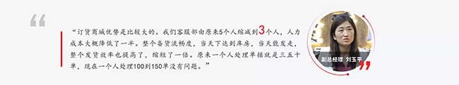 訂貨商城優勢是比較大的。我們客服部由原來5個人縮減到3個人,人力成本大概降低了一半。整個備貨流暢度,當天下達到庫房,當天能發走,整個發貨效率也提高了,縮短了一倍。原來一個人處理單據就是三五十單,現在一個人處理100到150單沒有問題。