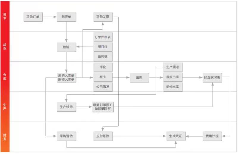 • 開發印版管理,將印版采購、驗收入庫、掛賬、開票付款、印版返修、印版用量等業務統一起來,并實現印版日報,費用計提,讓印版